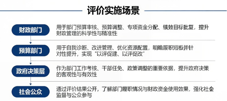 ▶ 社会公众:通过评价结果公开,了解部门履职情况与财政资金使用效果,强化社会监督与公众参与。