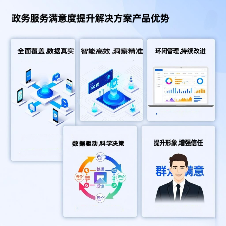 政务服务满意度提升解决方案是一套集数据采集、智能分析、问题追踪、持续改进于一体的全流程管理平台。该方案以提升群众对政务服务的满意度和获得感为核心目标,通过数字化手段打通政务服务评价的“最后一公里”,帮助政务部门精准把握群众需求,优化服务流程,改进工作作风,打造透明、高效、便捷的现代化政务服务体系。